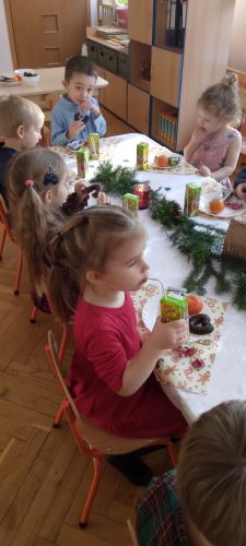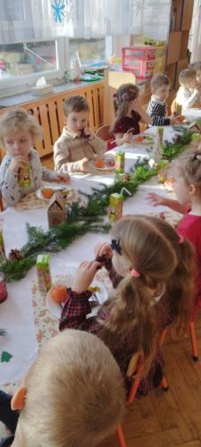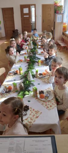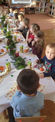 W piątek 19.12 2025 roku dzieci z grupy II odświętnie ubrane, uczestniczyły w uroczystym spotkaniu wigilijnym. Dzień ten od rana upływał w świątecznym nastroju, co podkreślały składane przez wszystkich pracowników życzenia świąteczne, po których zaczęliśmy wspólne kolędowanie. Kultywując tradycje Świąt Bożego Narodzenia zasiedliśmy do odświętnie nakrytych stołów, gdzie czekał świąteczny poczęstunek. Przy słuchaniu i wspólnym śpiewaniu polskich kolęd, czas upłynął w miłej, serdecznej atmosferze pełnej radości i wzajemnej życzliwości.